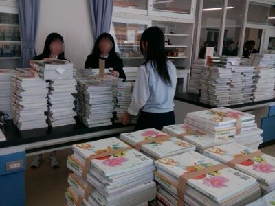新入生の教室で、教科書を並べたり、チェックしたり。