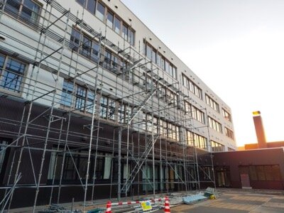 エアコン工事が始まっています。足場を組んでいるところ。